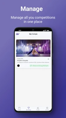 Key Features: - Browse Events: Explore a wide range of competitive events happening around you. - Enter Competitions: Register for your favorite competitions with just a few taps. - Track Your Schedule: Stay organized by tracking all your competition schedules in one place. - Manage Your Activities: Keep all your competition-related activities and tasks in check.