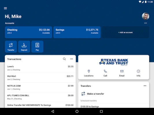 To use the Texas Bank and Trust Mobile App, you must be enrolled as a Texas Bank and Trust Company Internet Banking user. If you currently use our Internet Banking, simply download the app, launch it, and login with the same Internet Banking credentials. After you successfully login to the app, your accounts and transactions will begin updating.